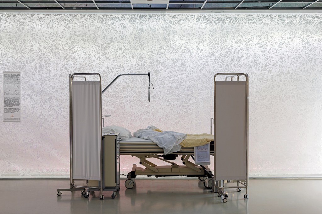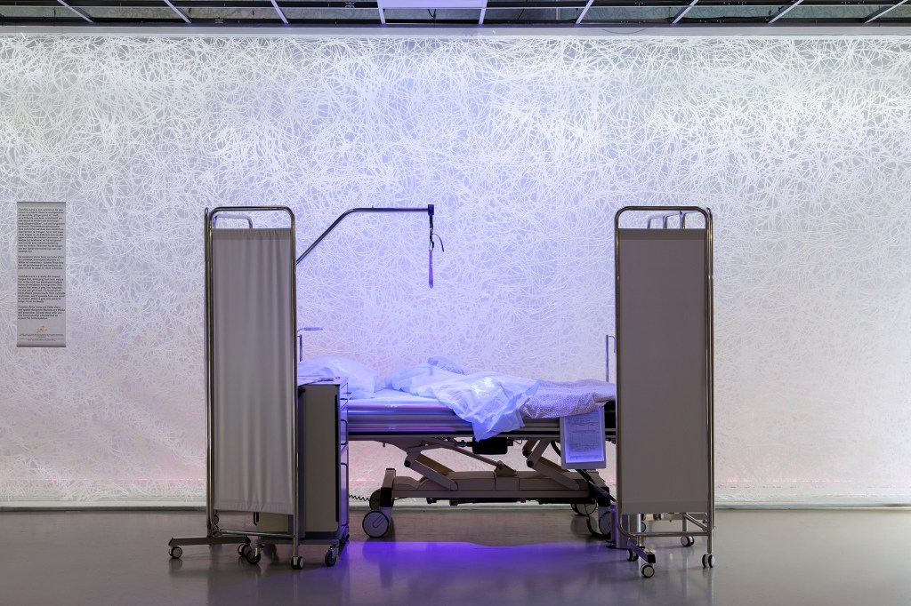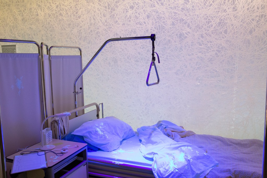 Ziekenhuisbed met Candida: Candida Auris is een recent ontdekte schimmel die, ontstaan door de vergiftiging van de bodem, meerdere vormen van resistentie tegen fungiciden heeft ontwikkeld. Dit betekent dat wanneer de schimmel eenmaal in ziekenhuizen terechtkomt, niemand hem meer kan verwijderen. Hij is te vinden op alle oppervlakken die mensen aanraken, van kasten tot telefoons, en verspreidt zich van de ene afdeling naar de andere. Wanneer de schimmel in de longen van patiënten terechtkomt, kan dit dodelijk zijn. Om de onzichtbare schimmel toch weer te kunnen geven hebben Marloes en Wikke ervoor gekozen om een blacklight te installeren die aan- en uit springt. Ik heb een ziekenhuis-setting gemaakt die 'clean' lijkt, maar als je dichterbij komt zie je dat de schimmel zich overal manifesteert.