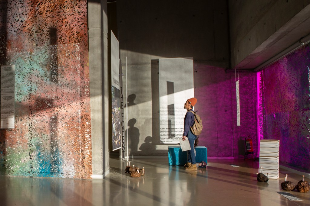 Tentoonstelling In de tentoonstelling FUNGI: Anarchist Designers, samengesteld door antropoloog Anna Tsing en architect en kunstenaar Feifei Zhou (terriStories), zijn schimmels onafhankelijk opererende wezens die op de puinhopen van het kapitalisme een heel eigen, multi-soortelijke wereld tot bloei brengen. In plaats van het alleen als een sexy, bruikbaar biomateriaal te presenteren worden onder andere ook de duistere kanten van de wereld van schimmels belicht, zowel als de coöperatieve systemen die fungi aangaan met andere organismen.