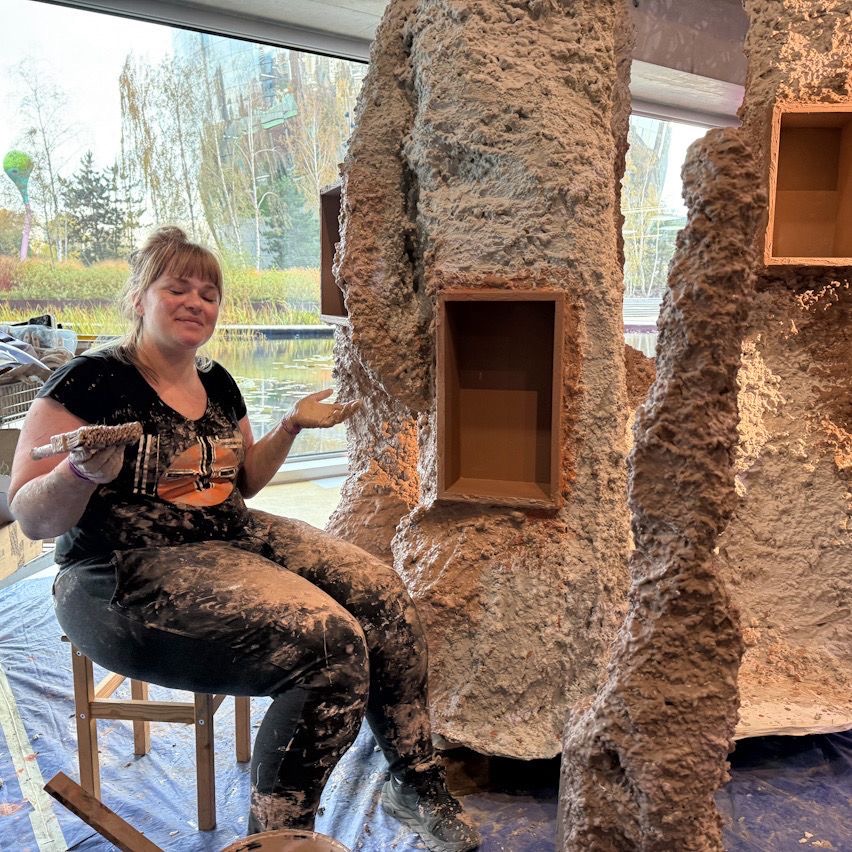 In deze termietenberg worden er in de vakken achter de showbakken echte stukjes termietenberg gepresenteerd. Aan mij was de vraag of ik een zo realistisch mogelijke termietenberg kon maken van 2,5 meter hoog met deze showmogelijkheid. Een ontzettend leuke sculpturale uitdaging en wat mij betreft zeer geslaagd. Onderaan deze pagina staan wat foto's van het work in progress.