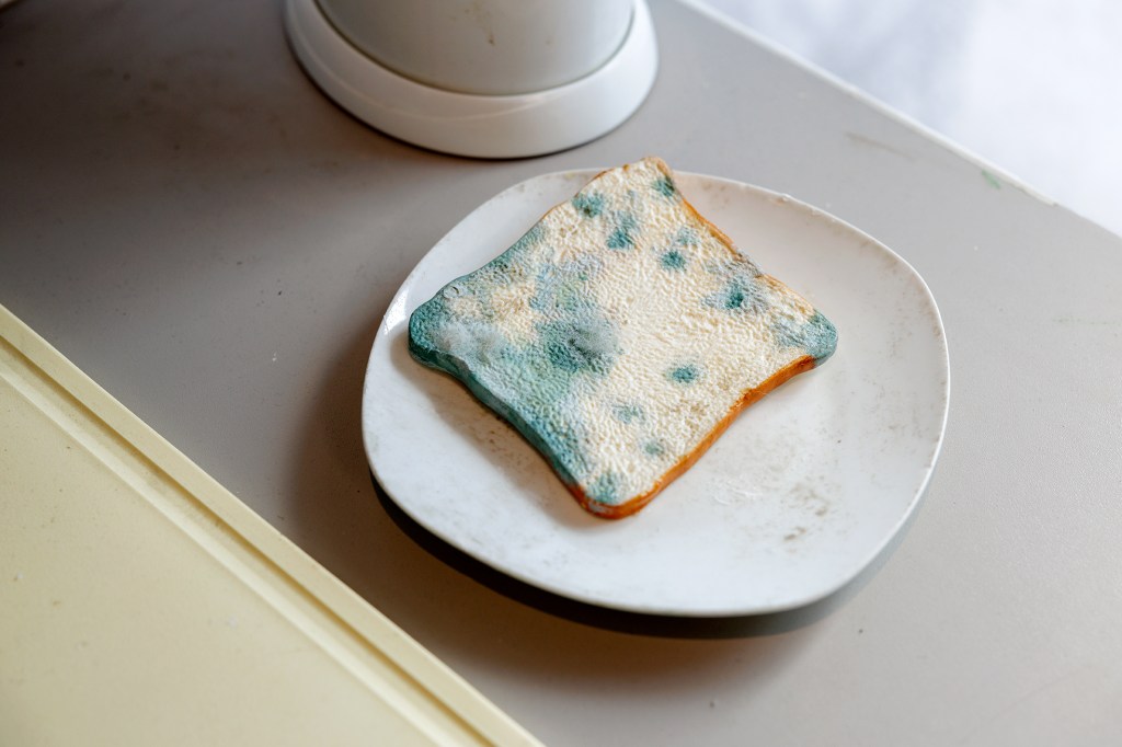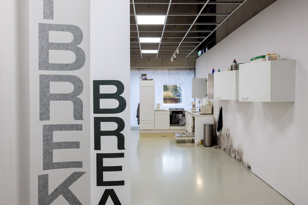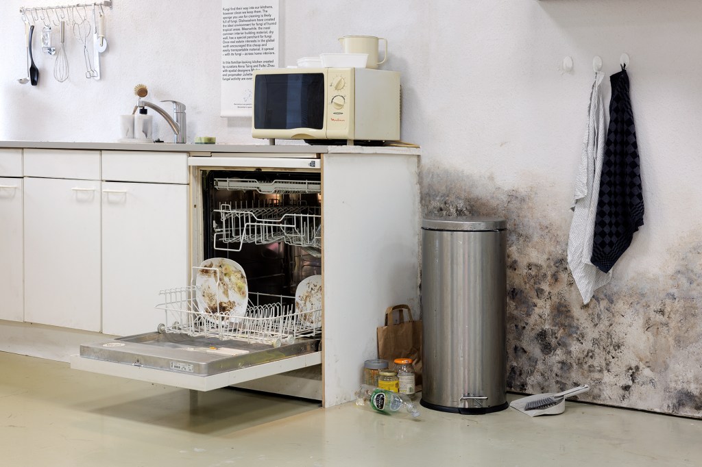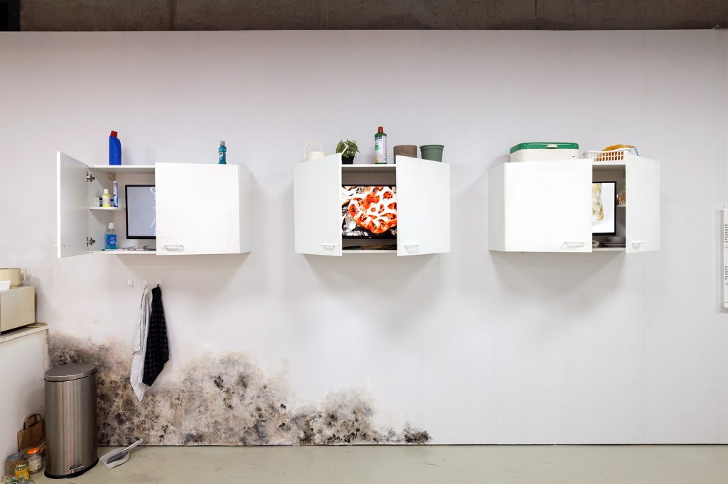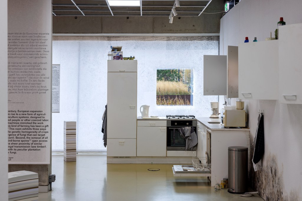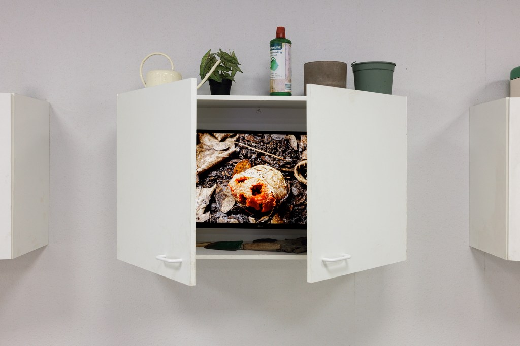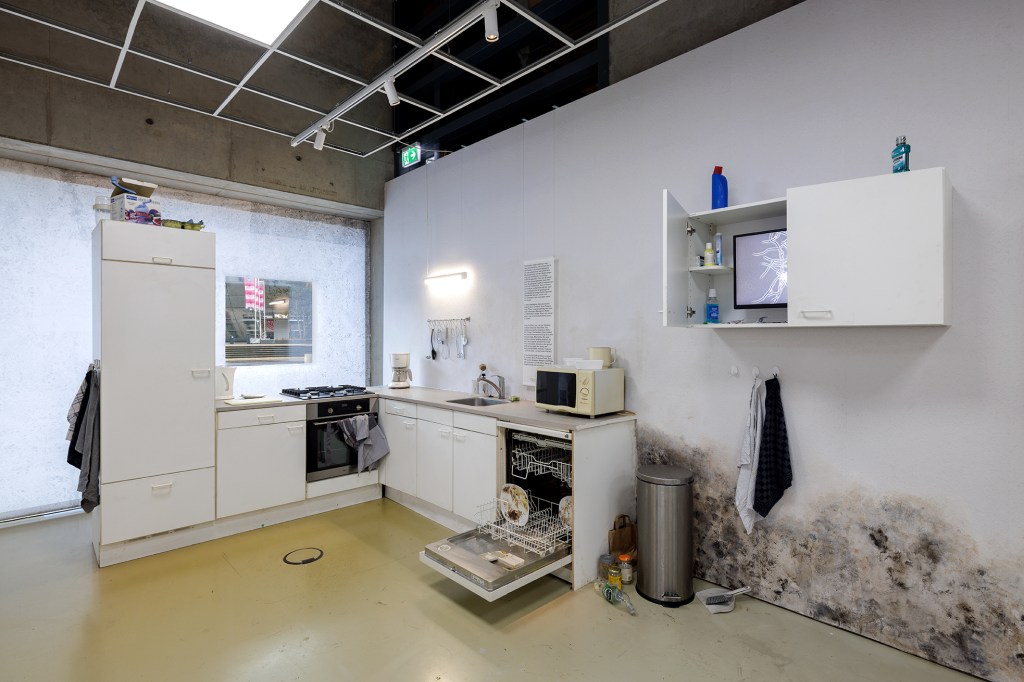 Schimmelkeuken: Hoe schoon we onze keukens ook houden, schimmels vinden er altijd wel een weg naartoe. De spons waarmee je schoonmaakt zit waarschijnlijk vol schimmels. Vaatwassers hebben de ideale omgeving gecreëerd voor schimmels uit vochtige tropische gebieden. En dan is er nog gipsplaat, het meest gebruikte bouwmateriaal binnenshuis, dat een bijzondere voorliefde voor schimmels heeft. Toen vastgoedbelangen in het noorden de groei van dit goedkope en gemakkelijk te vervoeren materiaal aanmoedigden, verspreidde het zich – inclusief de schimmels – door het hele huis. Voor dit onderdeel van de tentoonstelling werd mij gevraagd om een hyperrealistische keuken te realiseren om de schimmels die ons in het dagelijks leven omringen in te etaleren. Ook zie je bij de inloop drie keukenkastjes aan de wand die elk een video laten zien over deze schimmels. Elke kastje is ingericht met een paar objecten die aansluiten bij de inhoud van de video, en om de bezoeker een hint te geven over wat hij of zij binnenin zal vinden zijn er bijpassende rekwisieten op de buitenkant geplaatst. In de keuken zie je forse schimmel op de muur, op het aanrecht, een spons met schimmel, een beschimmelde boterham en een vaatwasser vol zwammen.