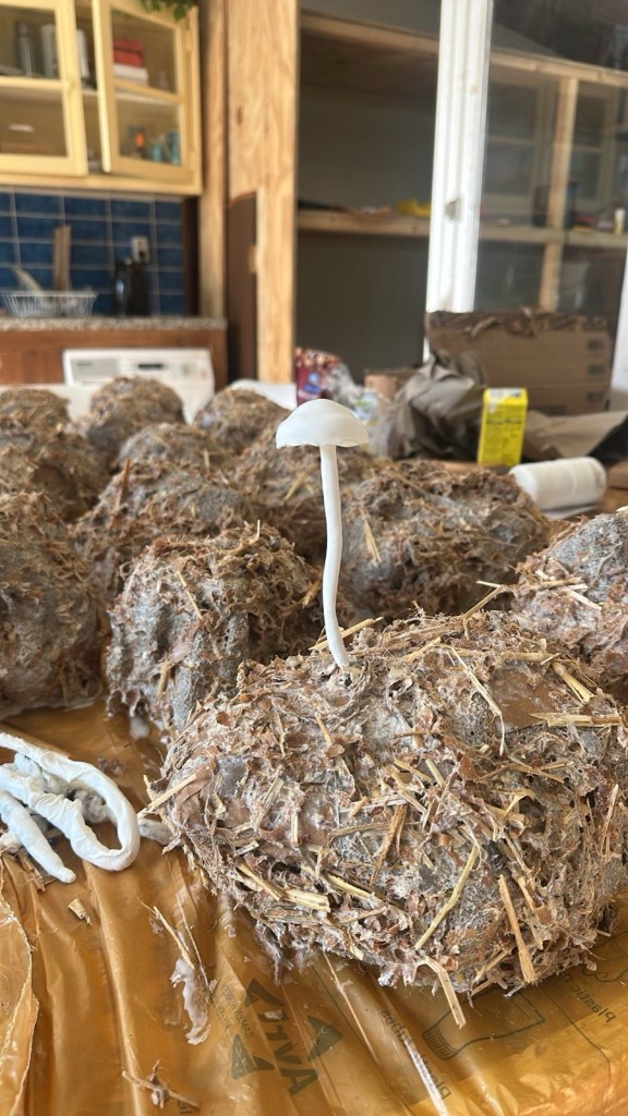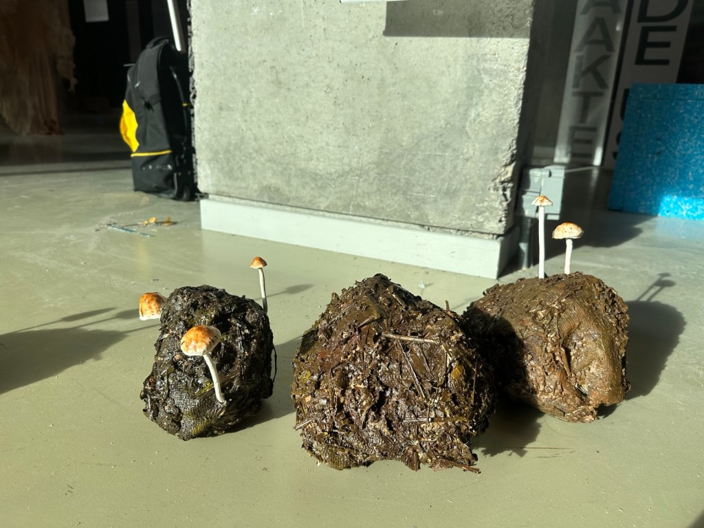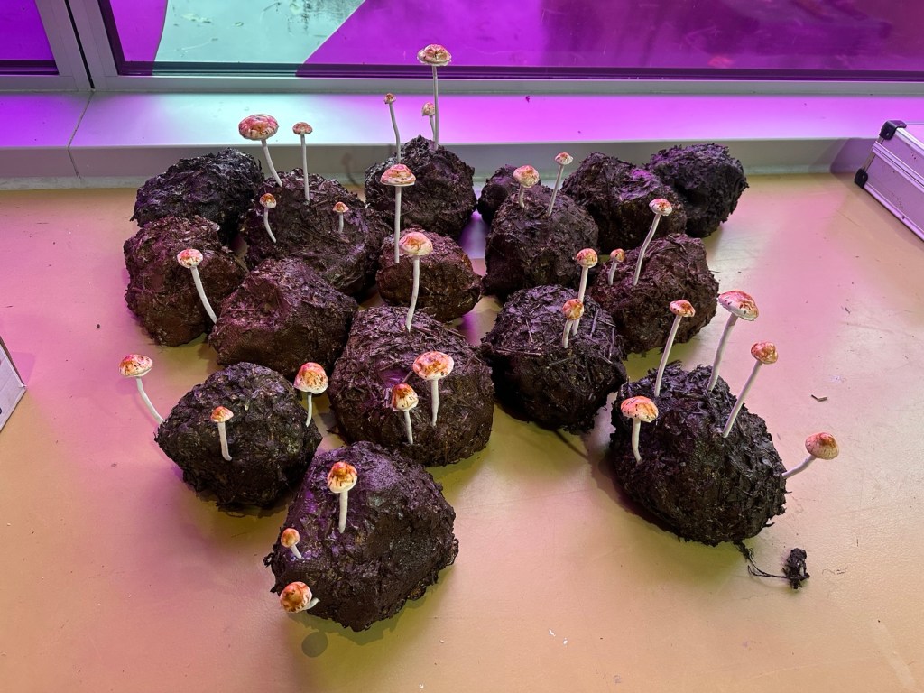 Olifantenpoep met Meststropharia: Een samenwerking tussen olifantenpoep en mestminnende schimmels. In de darmen van een olifant verteren schimmels planten, waardoor ze niet alleen zichzelf, maar ook de olifant voeden. Zelfs de verteerde resten, die als mest worden uitgescheiden, zijn een goede voedselbron voor andere schimmels, die zo voedingsstoffen aan de bodem teruggeven terwijl ze zichzelf voeden. Voor de tentoonstelling mocht ik een 16-tal realistische olifantendrollen maken met daarop de paddenstoelen die uitsluitend op deze poep groeien. Ontzettend leuk om te doen en zelfs The Guardian heeft er een recensie over geschreven!: