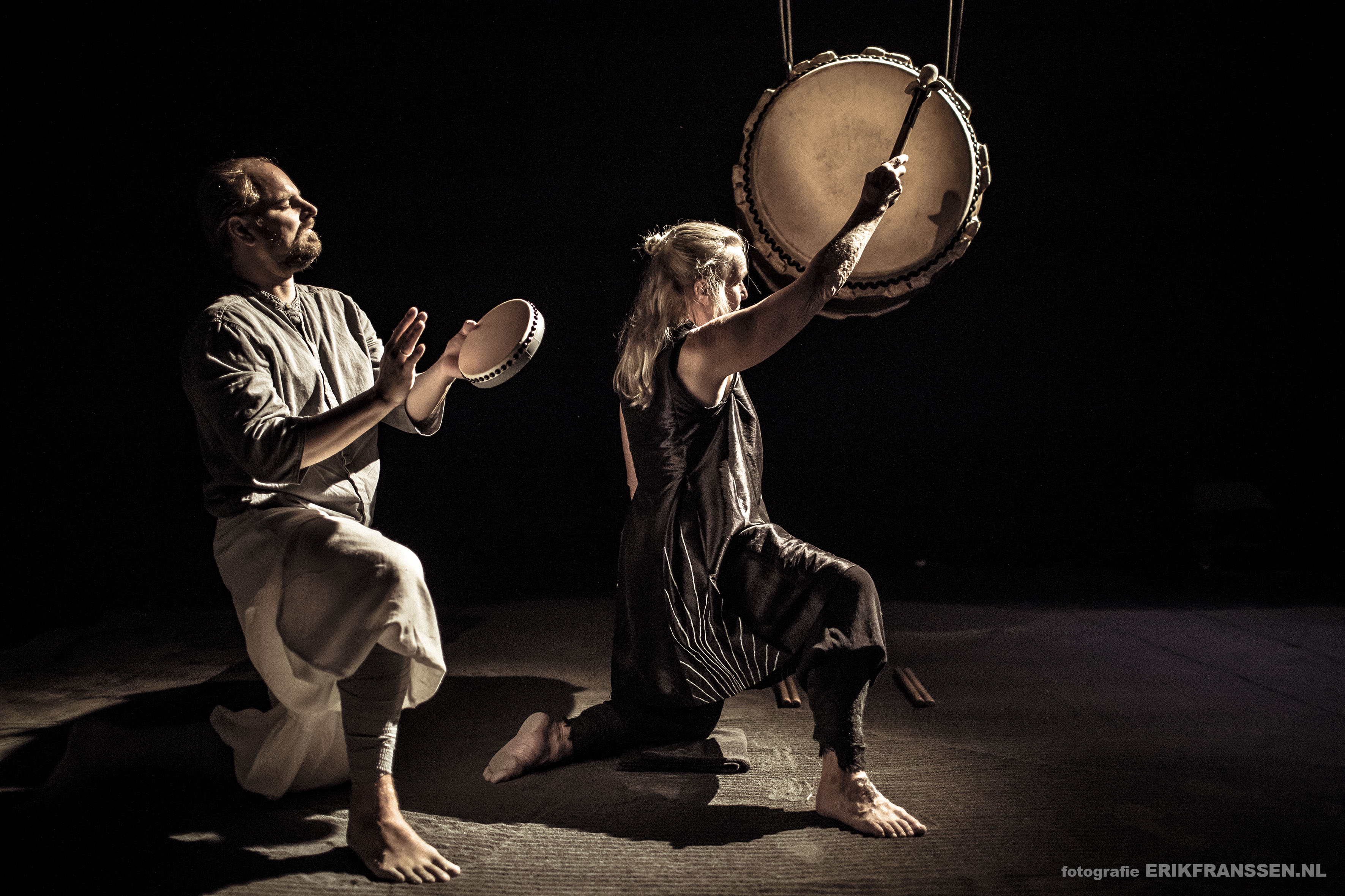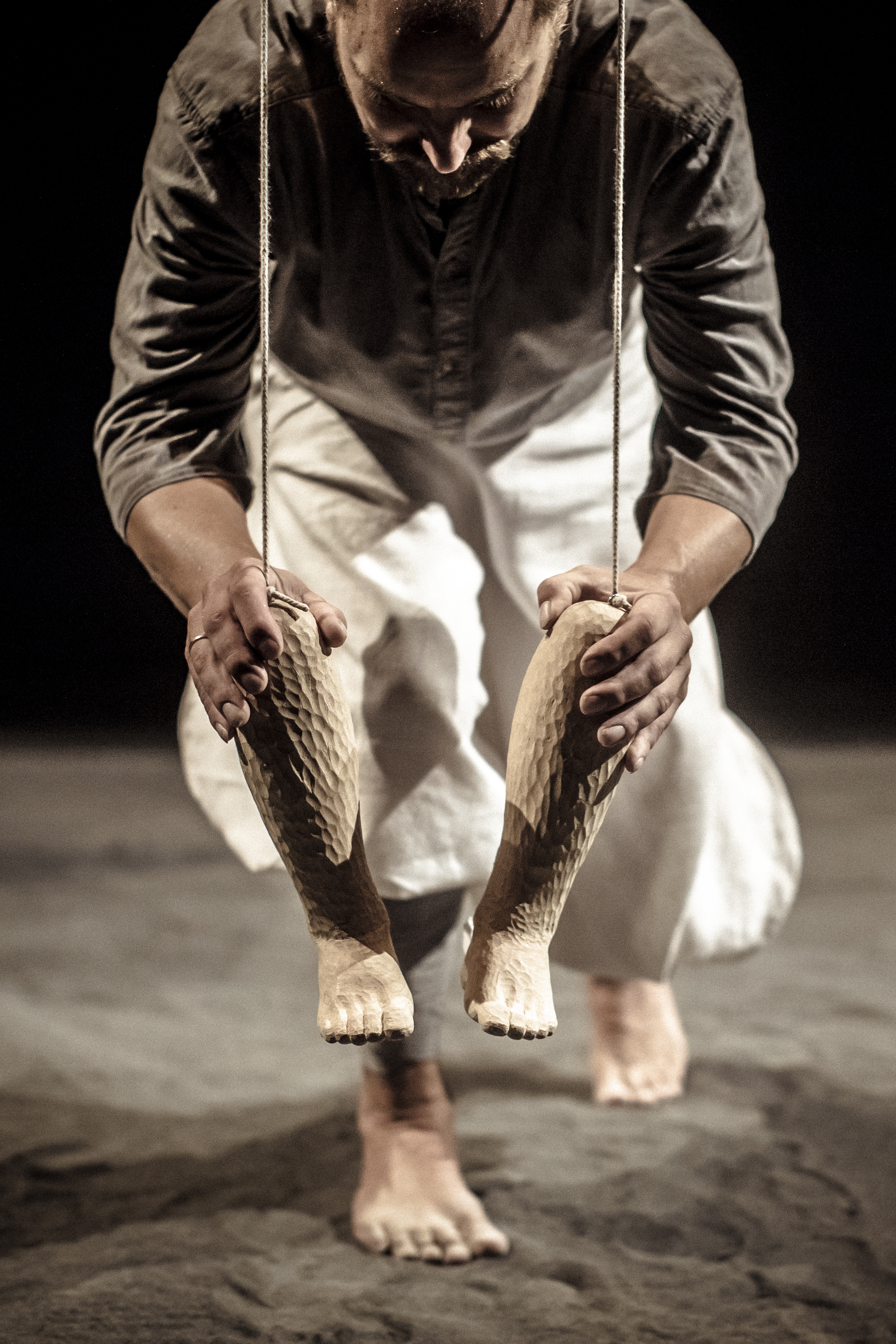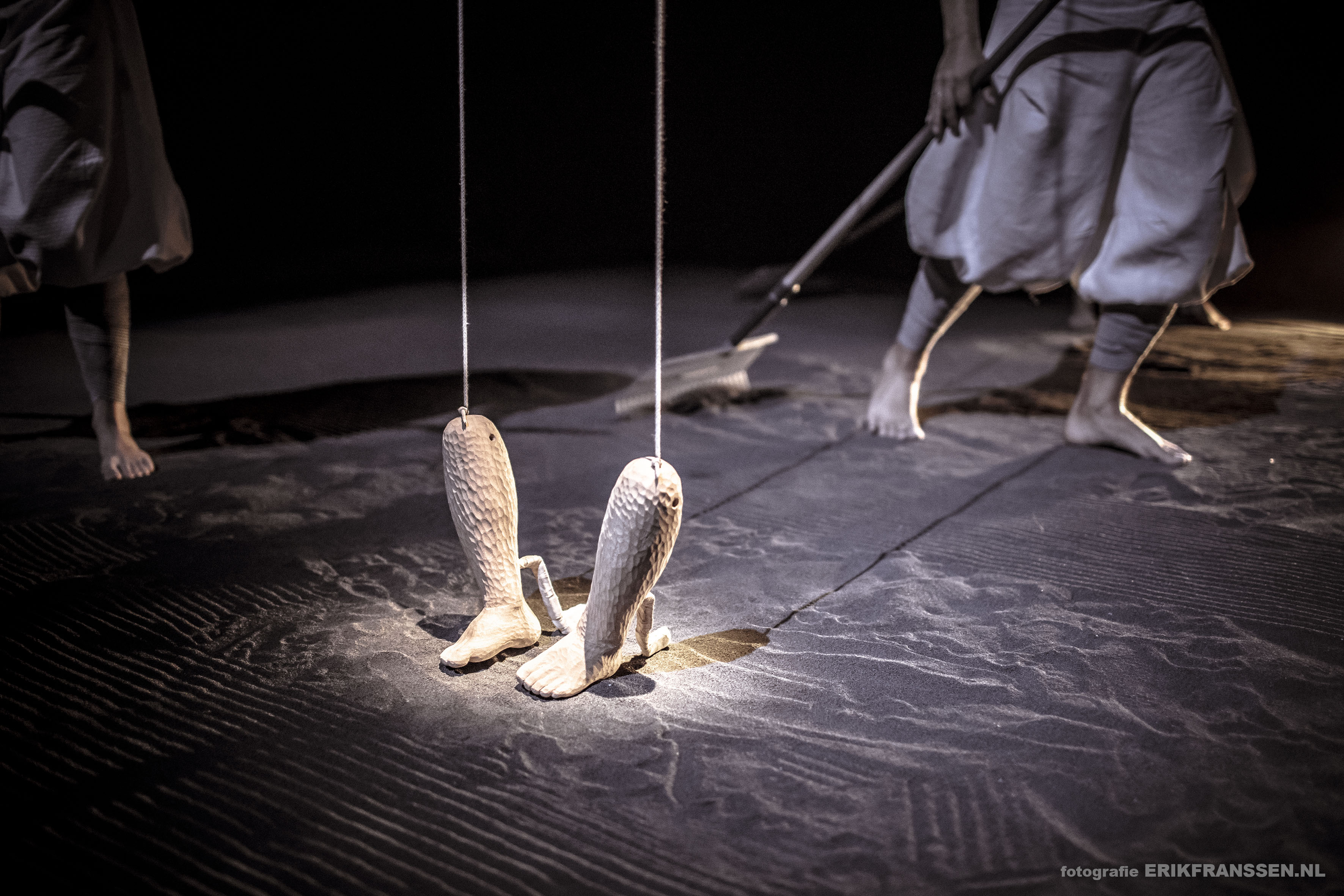 English: "We are so much in our heads that we sometimes forget our legs. Yet they are the ones who carry us and get us where we need to be. They indicate the pace, the rhythm in which we live. In The Art of Walking, carved legs come to life with the help of three (singing) players and an ingenious structure. Together with a taiko player they bring a musical ode to our legs. Walking - from stroll to march - determines the measure on which the legs are played. A playful ritual in a Japanese style, in which time stands still for a moment. " Scenography: For the scenography in this play I added an enormous floor of gravel where the footsteps of the players could be traced visually. For an extra layer of sensory experience, the sound of footsteps touching the stones was heard, as well as dust appearing visually with the performers taking bigger steps during the performance. For the costumes I found inspiration in old japanese paintings. The wide, volouminous trousers accentuate the tightly wrapped legs, that's what the show is all about. I wanted to stay away from direct japanese references so I blended in modern shirts dyed in a more fitting colour palette. The Art of Walking by Kameroperahuis is the debut of Tim Hammer as a director. The production, a collaboration with De Nieuwe Oost, is part of Tim Hammer's talent development trajectory at Kasko and Ulrike Quade Company. Within this process - made possible in part by the Nieuwe Makers subsidy from the Performing Arts Fund NL - Tim is researching an innovative form of musical theatre.