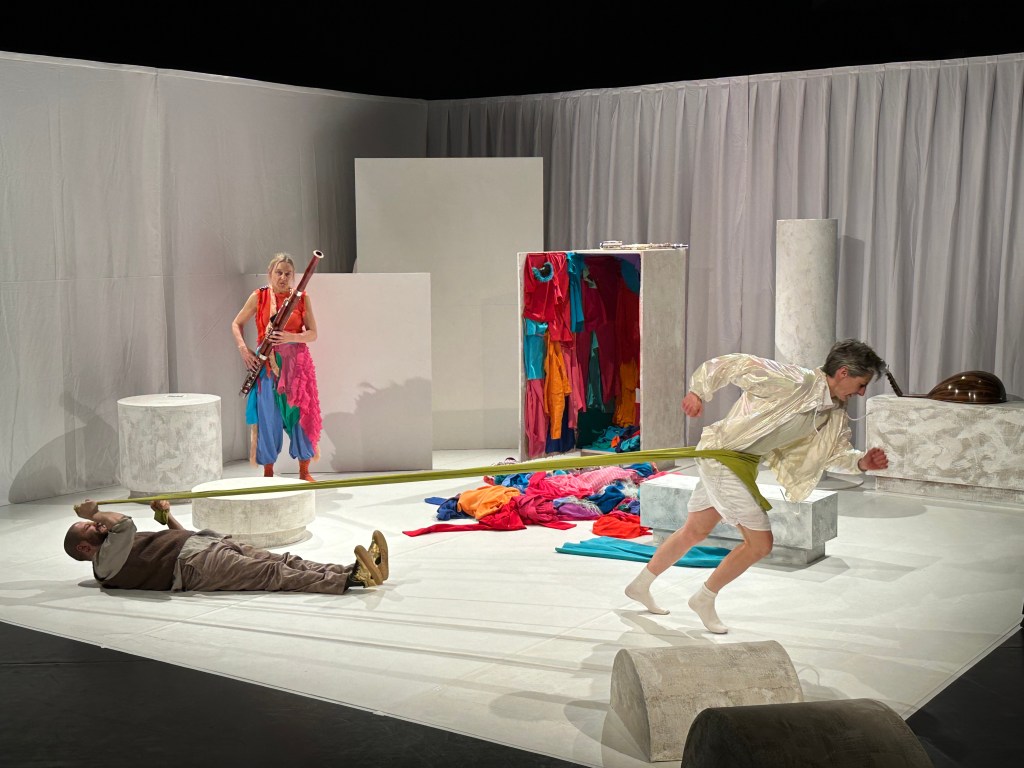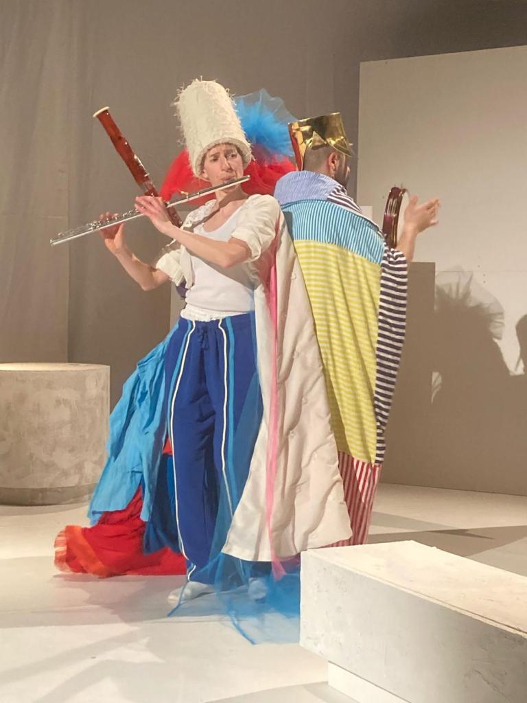 Drie musici spelen samen in een jas met zes mouwen of dragen een broek waar drie hoofden in passen. Uit een mouw verschijnt een glimmende fluit, uit een broekspijp een arm. Maar wat doen we met deze hoed waar maar één hoofd in past?